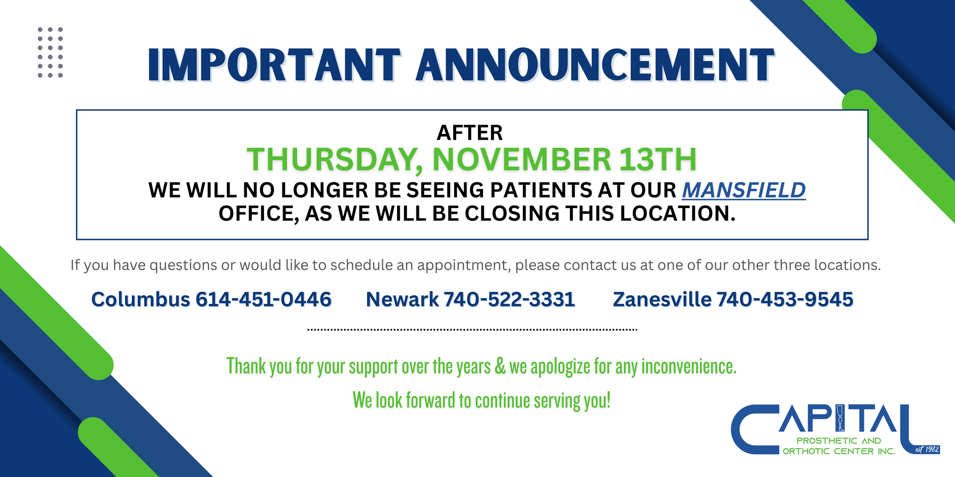 Welcome to Capital Prosthetic & Orthotic Center, Inc. Since 1982, we have been a family-owned company that offers unmatched orthotic and prosthetic services for patients throughout Central Ohio. We have four offices conveniently located in Columbus, Mansfield, Newark, and Zanesville to ensure access to high quality care. We believe that each patient should receive the highest level of customer service and personal attention. Our ABC certified and licensed practitioners not only have a passion for prosthetics and orthotics, but for providing the best possible patient experience. Whether you are in need of a custom brace or a prosthetic limb, we aim to make your experience with us as stress-free as possible as we assist in your recovery.
